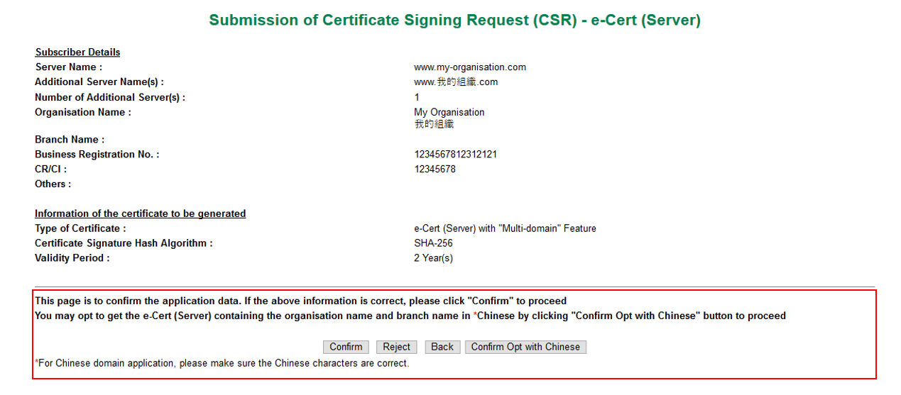 Yes. Starting from 1 July 2019, subscriber may choose an e-Cert (Server) showing the organization name and branch name in Chinese during the submission of Certificate Signing Request (CSR).
